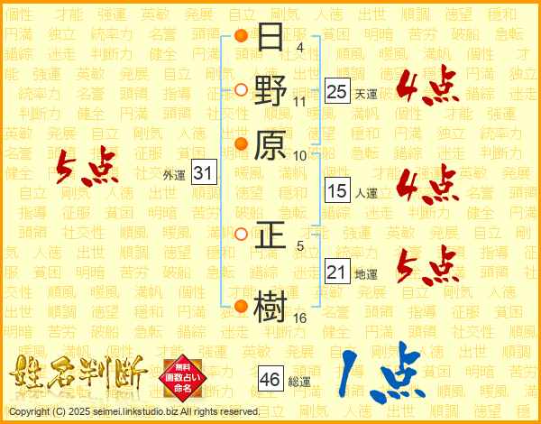 日(4画)野(11画)原(10画) 正(5画)樹(16画)