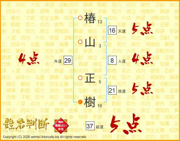 椿山正樹さんの総運は37画の5点!