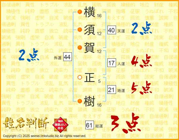 横(16画)須(12画)賀(12画) 正(5画)樹(16画)