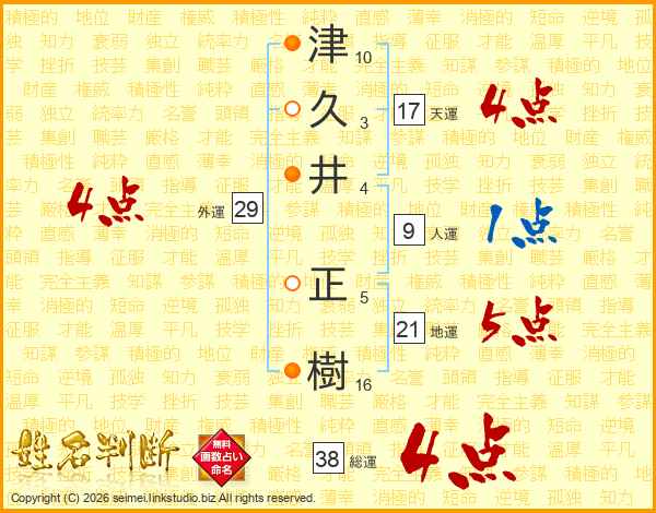 津(10画)久(3画)井(4画) 正(5画)樹(16画)