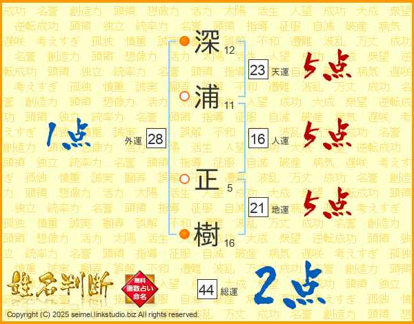 あなたの人生を表す1番重要な運勢です。生涯を通じて影響する総合運となり、主に50歳以降の晩年期に影響を及ぼします。苗字と名前の合計画数。
