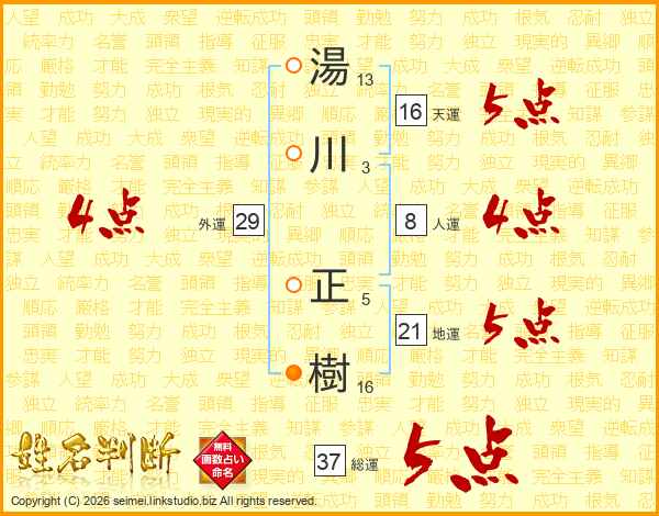 湯(13画)川(3画) 正(5画)樹(16画)