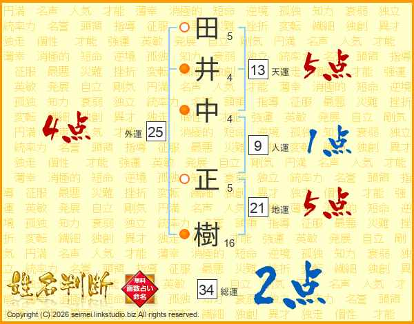 田(5画)井(4画)中(4画) 正(5画)樹(16画)