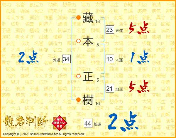 あなたの人生を表す1番重要な運勢です。生涯を通じて影響する総合運となり、主に50歳以降の晩年期に影響を及ぼします。苗字と名前の合計画数。