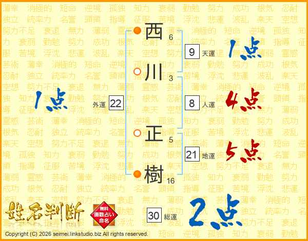 あなたの人生を表す1番重要な運勢です。生涯を通じて影響する総合運となり、主に50歳以降の晩年期に影響を及ぼします。苗字と名前の合計画数。