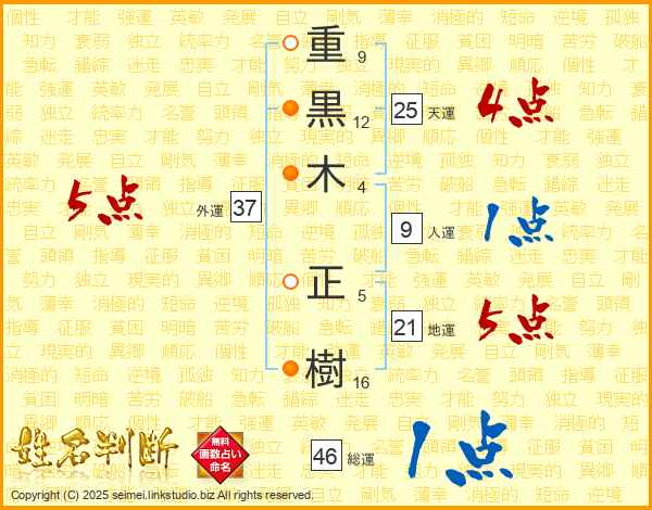 重(9画)黒(12画)木(4画) 正(5画)樹(16画)