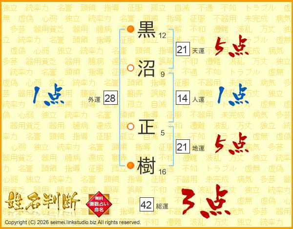 黒(12画)沼(9画) 正(5画)樹(16画)