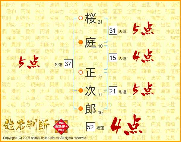 桜(21画)庭(10画) 正(5画)次(6画)郎(10画)