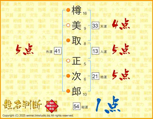 樽(16画)美(9画)取(8画) 正(5画)次(6画)郎(10画)