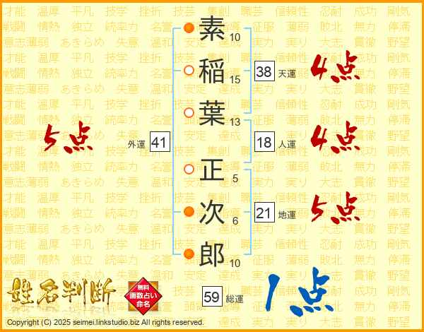 素(10画)稲(15画)葉(13画) 正(5画)次(6画)郎(10画)