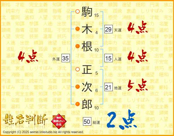 駒(15画)木(4画)根(10画) 正(5画)次(6画)郎(10画)