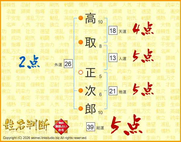 高(10画)取(8画) 正(5画)次(6画)郎(10画)