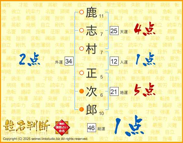 鹿(11画)志(7画)村(7画) 正(5画)次(6画)郎(10画)