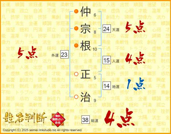 仲(6画)宗(8画)根(10画) 正(5画)治(9画)