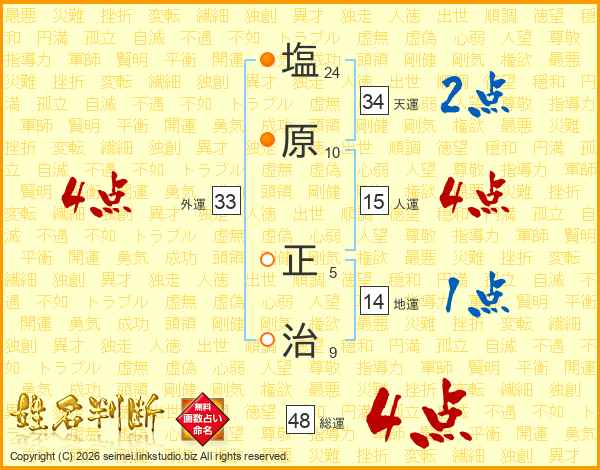 あなたの人生を表す1番重要な運勢です。生涯を通じて影響する総合運となり、主に50歳以降の晩年期に影響を及ぼします。苗字と名前の合計画数。