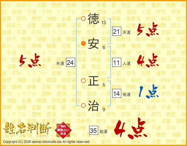 徳(15画)安(6画) 正(5画)治(9画)