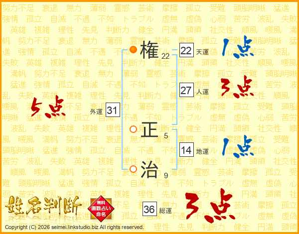 あなたの人生を表す1番重要な運勢です。生涯を通じて影響する総合運となり、主に50歳以降の晩年期に影響を及ぼします。苗字と名前の合計画数。