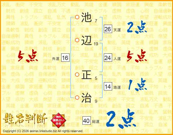 生活面を象徴する運勢です。外部から受ける影響力を表し、結婚運、家庭運や職場、環境への順応性を表します。総運から人運を引いた画数。姓や名が1文字の場合を除く。