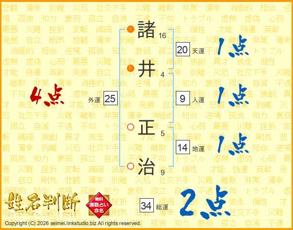 あなたの人生を表す1番重要な運勢です。生涯を通じて影響する総合運となり、主に50歳以降の晩年期に影響を及ぼします。苗字と名前の合計画数。