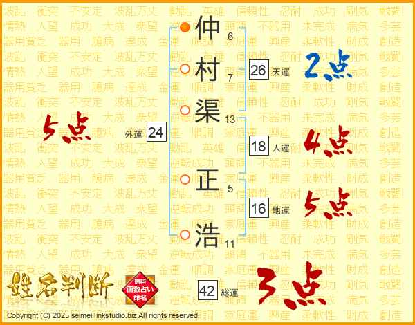 仲(6画)村(7画)渠(13画) 正(5画)浩(11画)