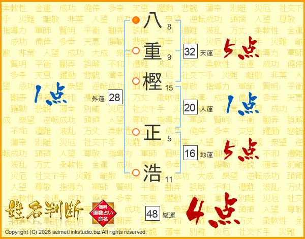 八(8画)重(9画)樫(15画) 正(5画)浩(11画)