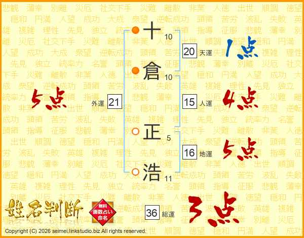 あなたの人生を表す1番重要な運勢です。生涯を通じて影響する総合運となり、主に50歳以降の晩年期に影響を及ぼします。苗字と名前の合計画数。