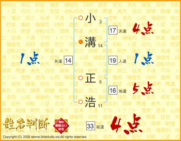 生活面を象徴する運勢です。外部から受ける影響力を表し、結婚運、家庭運や職場、環境への順応性を表します。総運から人運を引いた画数。姓や名が1文字の場合を除く。