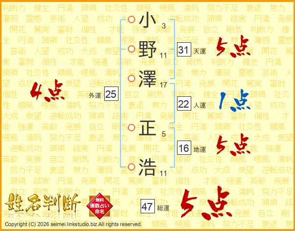 小(3画)野(11画)澤(17画) 正(5画)浩(11画)
