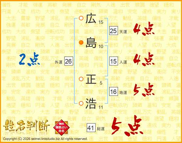 広(15画)島(10画) 正(5画)浩(11画)
