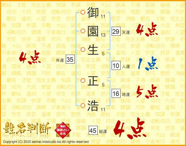 御(11画)園(13画)生(5画) 正(5画)浩(11画)