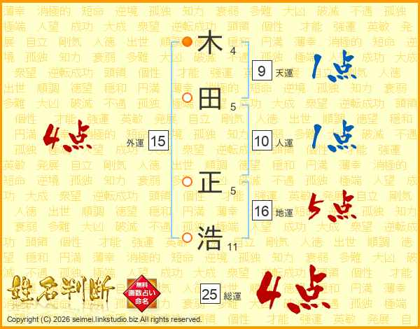 木(4画)田(5画) 正(5画)浩(11画)