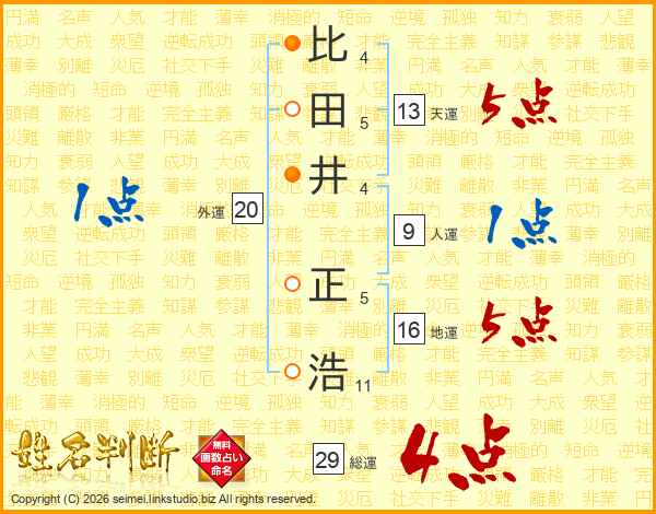 比(4画)田(5画)井(4画) 正(5画)浩(11画)