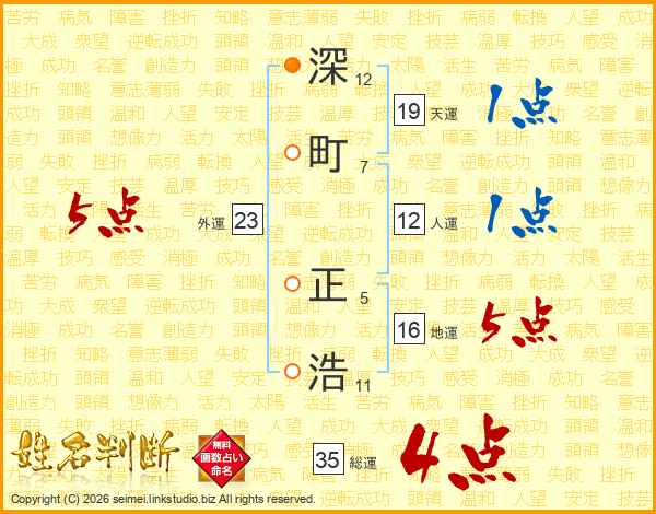 あなたの人生を表す1番重要な運勢です。生涯を通じて影響する総合運となり、主に50歳以降の晩年期に影響を及ぼします。苗字と名前の合計画数。