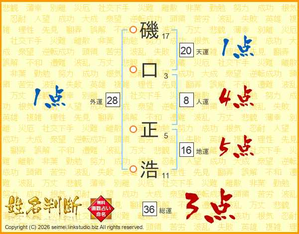 生活面を象徴する運勢です。外部から受ける影響力を表し、結婚運、家庭運や職場、環境への順応性を表します。総運から人運を引いた画数。姓や名が1文字の場合を除く。