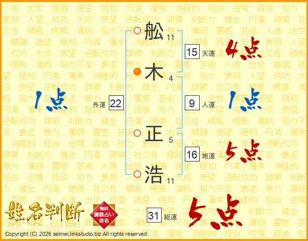 舩(11画)木(4画) 正(5画)浩(11画)
