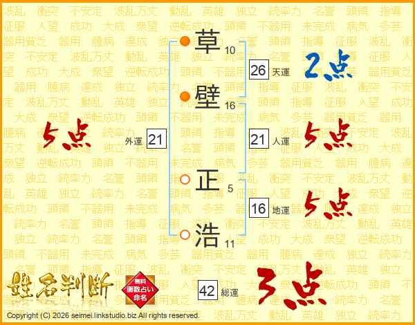 あなたの人生を表す1番重要な運勢です。生涯を通じて影響する総合運となり、主に50歳以降の晩年期に影響を及ぼします。苗字と名前の合計画数。