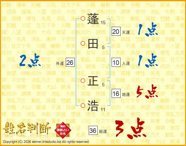 蓬(15画)田(5画) 正(5画)浩(11画)