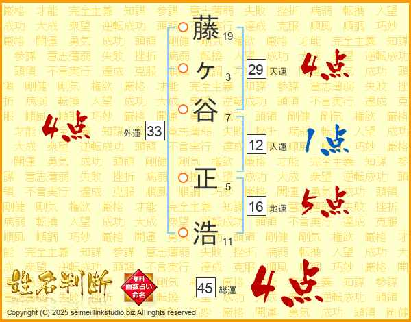 藤(19画)ヶ(3画)谷(7画) 正(5画)浩(11画)