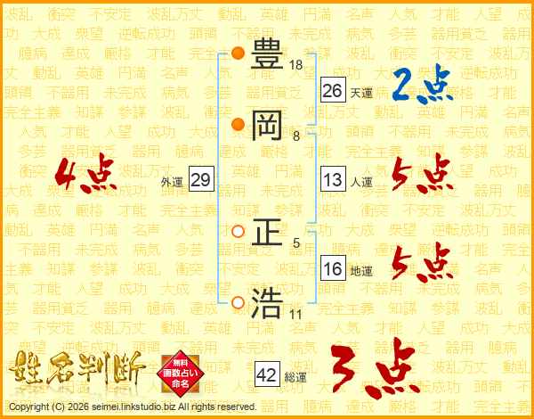 豊(18画)岡(8画) 正(5画)浩(11画)