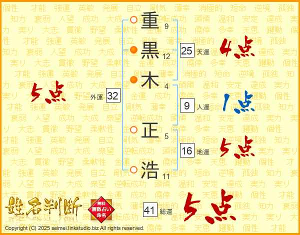 重(9画)黒(12画)木(4画) 正(5画)浩(11画)