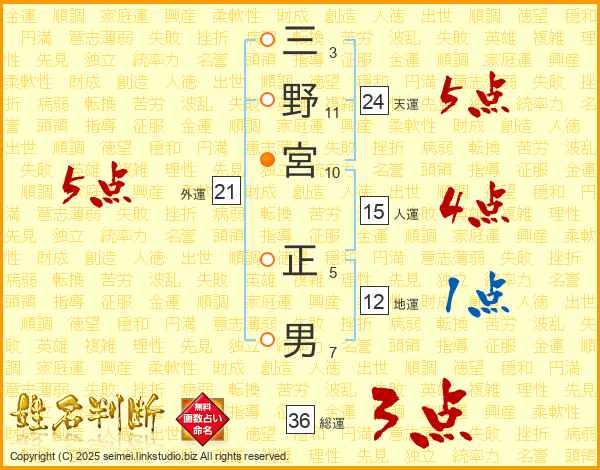 三(3画)野(11画)宮(10画) 正(5画)男(7画)