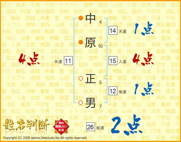 あなたの人生を表す1番重要な運勢です。生涯を通じて影響する総合運となり、主に50歳以降の晩年期に影響を及ぼします。苗字と名前の合計画数。