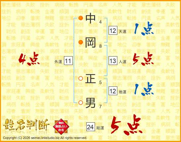 あなたの人生を表す1番重要な運勢です。生涯を通じて影響する総合運となり、主に50歳以降の晩年期に影響を及ぼします。苗字と名前の合計画数。