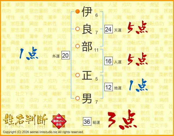 伊(6画)良(7画)部(11画) 正(5画)男(7画)