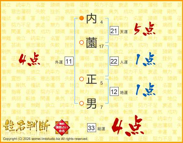 生活面を象徴する運勢です。外部から受ける影響力を表し、結婚運、家庭運や職場、環境への順応性を表します。総運から人運を引いた画数。姓や名が1文字の場合を除く。