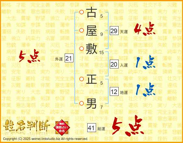 古(5画)屋(9画)敷(15画) 正(5画)男(7画)