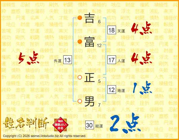 吉(6画)富(12画) 正(5画)男(7画)
