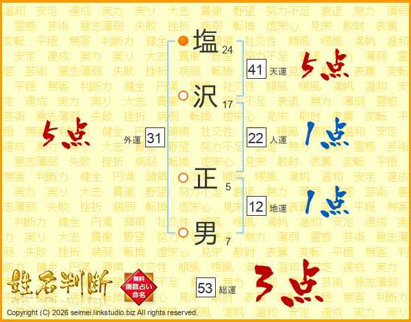 塩(24画)沢(17画) 正(5画)男(7画)