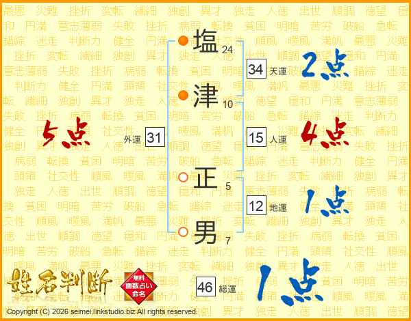 塩(24画)津(10画) 正(5画)男(7画)