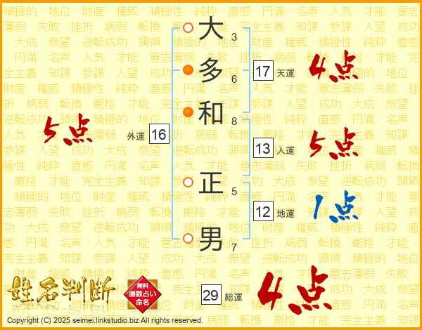 大(3画)多(6画)和(8画) 正(5画)男(7画)